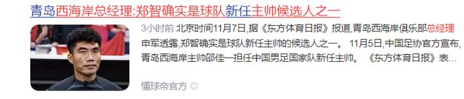 而就在刚刚,《东方体育日报》发布独家消息,经青岛西海岸总经理申军证实,外界传言的郑智确实是球队主帅候选人之一,所以不出意外的话,郑智下赛季将会接替邵佳一出任青岛西海岸主帅。